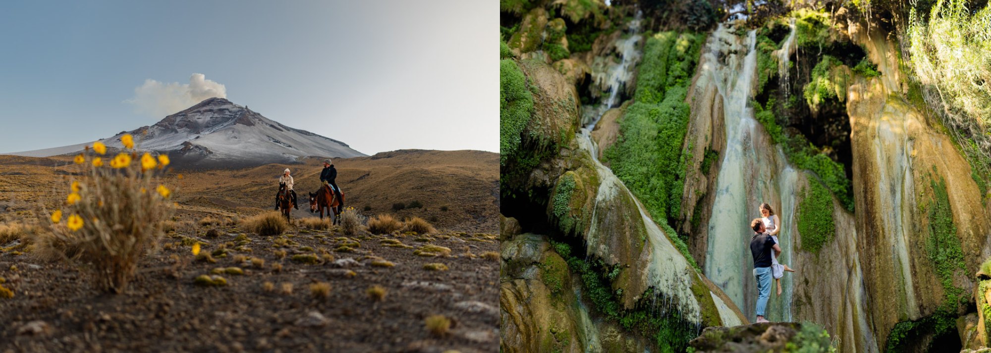 The following days shifted the experience from (colder) high-altitude mountains to (warmer) lower-altitude sceneries and waterfalls. A private horseback ride through the foothills below Popocatépetl gave a whole new perspective of the volcano our clients had just climbed.