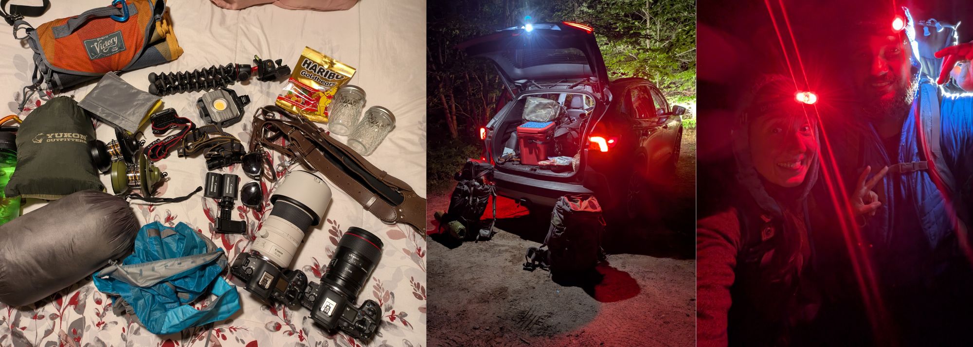 To make this happen, we not only had to pack all of our photography and drone gear, we also had to pack water, snacks, sleeping bags and mats, and the little extras we like to bring for our couples to celebrate with afterwards. Check out the pictures below for an idea of what all that looks like!